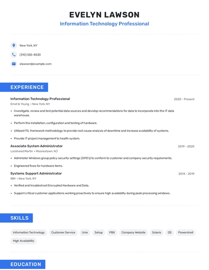 Build a professional information technology professional resume in minutes. Browse through our resume examples to identify the best way to word your resume. Then choose from 5+ resume templates to create your information technology professional resume.
