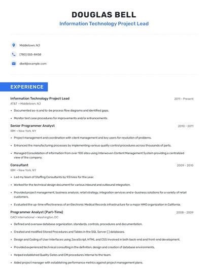 Build a professional information technology project lead resume in minutes. Browse through our resume examples to identify the best way to word your resume. Then choose from 5+ resume templates to create your information technology project lead resume.