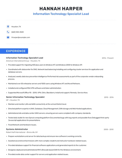 Build a professional information technology specialist lead resume in minutes. Browse through our resume examples to identify the best way to word your resume. Then choose from 5+ resume templates to create your information technology specialist lead resume.