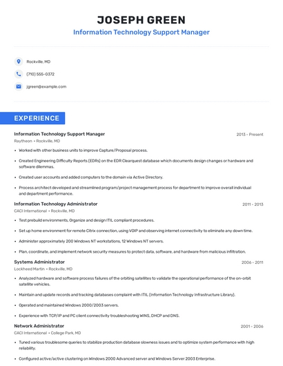 Build a professional information technology support manager resume in minutes. Browse through our resume examples to identify the best way to word your resume. Then choose from 5+ resume templates to create your information technology support manager resume.