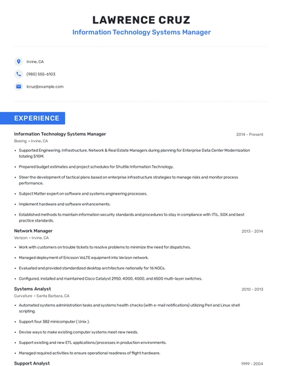 Build a professional information technology systems manager resume in minutes. Browse through our resume examples to identify the best way to word your resume. Then choose from 5+ resume templates to create your information technology systems manager resume.
