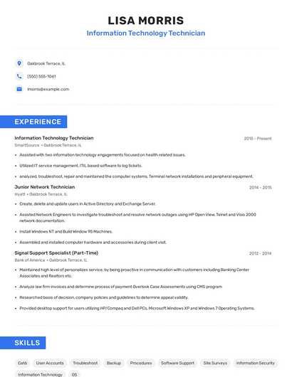Build a professional information technology technician resume in minutes. Browse through our resume examples to identify the best way to word your resume. Then choose from 5+ resume templates to create your information technology technician resume.