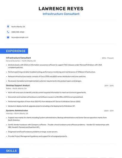 Build a professional infrastructure consultant resume in minutes. Browse through our resume examples to identify the best way to word your resume. Then choose from 5+ resume templates to create your infrastructure consultant resume.