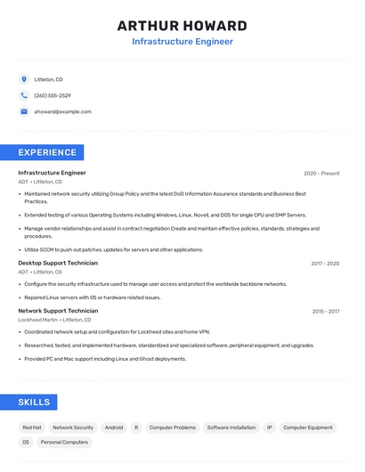 Build a professional infrastructure engineer resume in minutes. Browse through our resume examples to identify the best way to word your resume. Then choose from 5+ resume templates to create your infrastructure engineer resume.