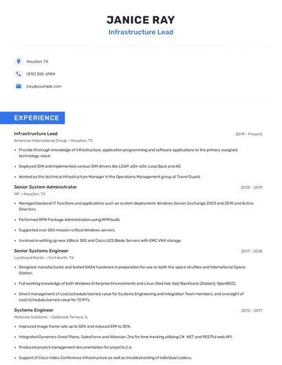 Build a professional infrastructure lead resume in minutes. Browse through our resume examples to identify the best way to word your resume. Then choose from 5+ resume templates to create your infrastructure lead resume.