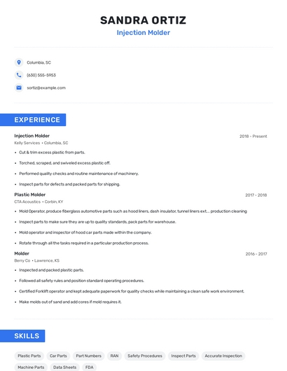 Build a professional injection molder resume in minutes. Browse through our resume examples to identify the best way to word your resume. Then choose from 5+ resume templates to create your injection molder resume.