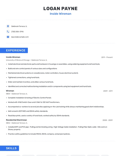 Build a professional inside wireman resume in minutes. Browse through our resume examples to identify the best way to word your resume. Then choose from 5+ resume templates to create your inside wireman resume.