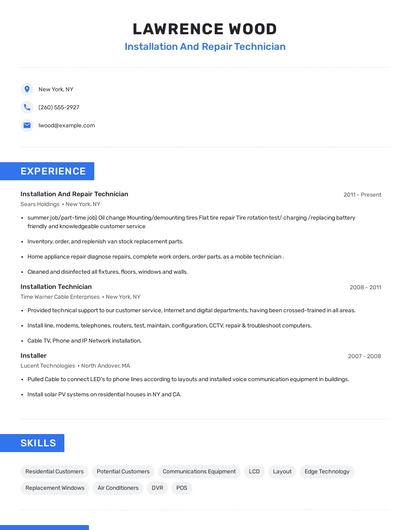 Build a professional installation and repair technician resume in minutes. Browse through our resume examples to identify the best way to word your resume. Then choose from 5+ resume templates to create your installation and repair technician resume.