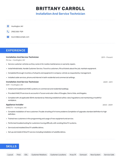 Build a professional installation and service technician resume in minutes. Browse through our resume examples to identify the best way to word your resume. Then choose from 5+ resume templates to create your installation and service technician resume.