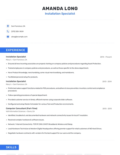 Build a professional installation specialist resume in minutes. Browse through our resume examples to identify the best way to word your resume. Then choose from 5+ resume templates to create your installation specialist resume.