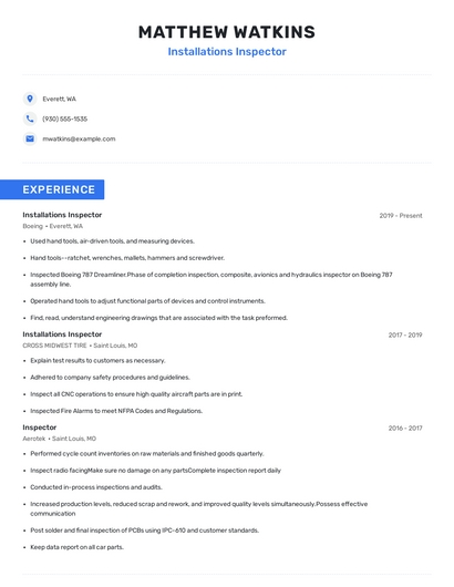 Choose from 10+ customizable installations inspector resume templates