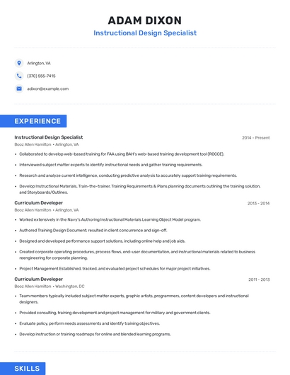Build a professional instructional design specialist resume in minutes. Browse through our resume examples to identify the best way to word your resume. Then choose from 5+ resume templates to create your instructional design specialist resume.