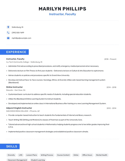 Build a professional instructor, faculty resume in minutes. Browse through our resume examples to identify the best way to word your resume. Then choose from 5+ resume templates to create your instructor, faculty resume.