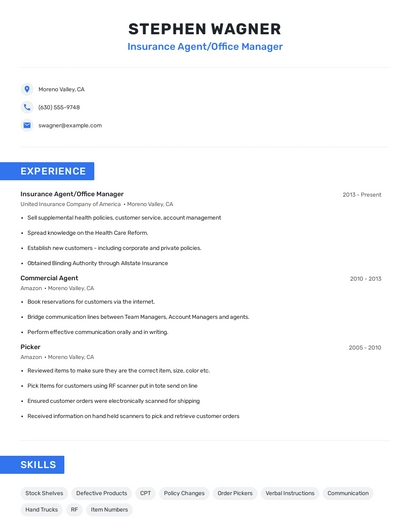 Build a professional insurance agent/office manager resume in minutes. Browse through our resume examples to identify the best way to word your resume. Then choose from 5+ resume templates to create your insurance agent/office manager resume.