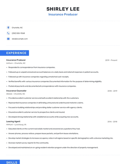 Build a professional insurance producer resume in minutes. Browse through our resume examples to identify the best way to word your resume. Then choose from 5+ resume templates to create your insurance producer resume.