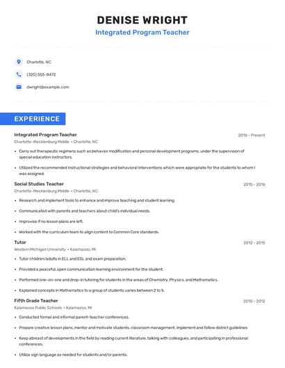 Build a professional integrated program teacher resume in minutes. Browse through our resume examples to identify the best way to word your resume. Then choose from 5+ resume templates to create your integrated program teacher resume.