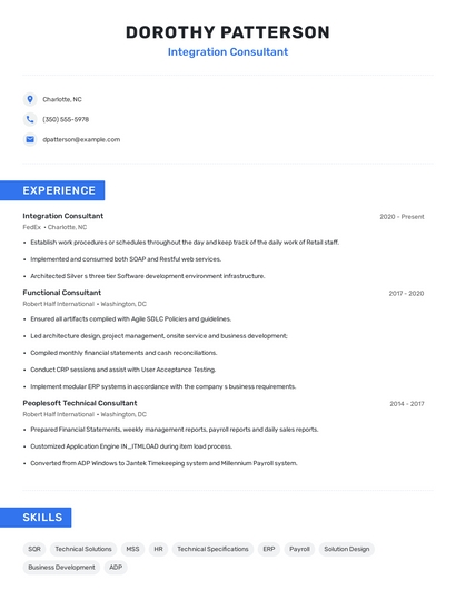 Build a professional integration consultant resume in minutes. Browse through our resume examples to identify the best way to word your resume. Then choose from 5+ resume templates to create your integration consultant resume.