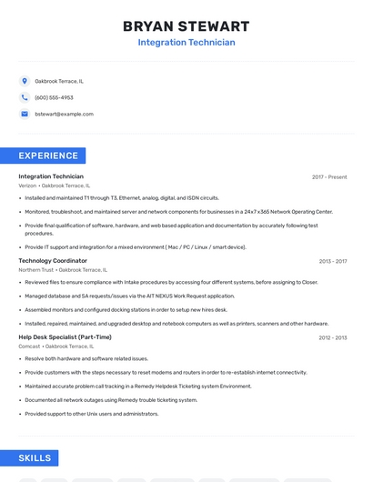 Build a professional integration technician resume in minutes. Browse through our resume examples to identify the best way to word your resume. Then choose from 5+ resume templates to create your integration technician resume.