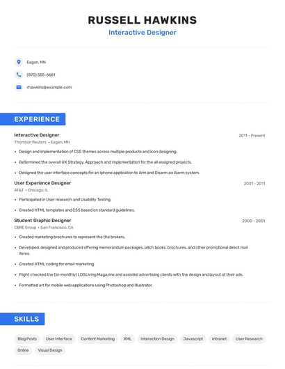 Build a professional interactive designer resume in minutes. Browse through our resume examples to identify the best way to word your resume. Then choose from 5+ resume templates to create your interactive designer resume.