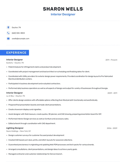 Build a professional interior designer resume in minutes. Browse through our resume examples to identify the best way to word your resume. Then choose from 5+ resume templates to create your interior designer resume.
