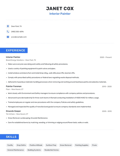 Build a professional interior painter resume in minutes. Browse through our resume examples to identify the best way to word your resume. Then choose from 5+ resume templates to create your interior painter resume.
