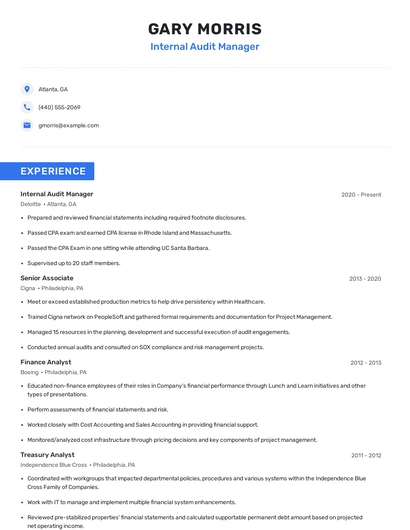 Build a professional internal audit manager resume in minutes. Browse through our resume examples to identify the best way to word your resume. Then choose from 5+ resume templates to create your internal audit manager resume.