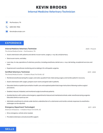 Build a professional internal medicine veterinary technician resume in minutes. Browse through our resume examples to identify the best way to word your resume. Then choose from 5+ resume templates to create your internal medicine veterinary technician resume.