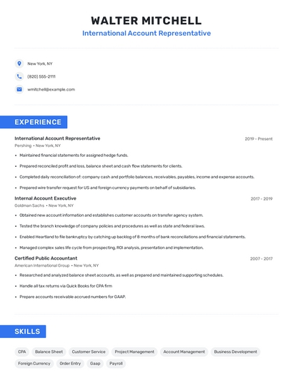 Build a professional international account representative resume in minutes. Our AI resume writing assistant will guide you through every step of the process, and you can choose from 10+ resume templates to create your international account representative resume.7. Financial Reports