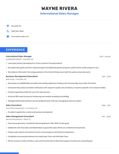 Build a professional international sales manager resume in minutes. Browse through our resume examples to identify the best way to word your resume. Then choose from 5+ resume templates to create your international sales manager resume.
