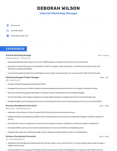 Build a professional internet marketing manager resume in minutes. Browse through our resume examples to identify the best way to word your resume. Then choose from 5+ resume templates to create your internet marketing manager resume.