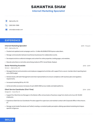 Build a professional internet marketing specialist resume in minutes. Browse through our resume examples to identify the best way to word your resume. Then choose from 5+ resume templates to create your internet marketing specialist resume.