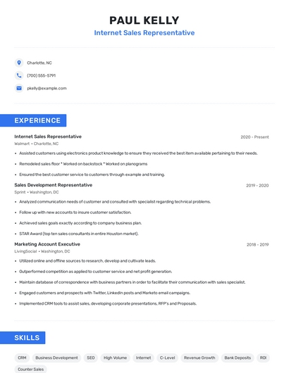 Build a professional internet sales representative resume in minutes. Browse through our resume examples to identify the best way to word your resume. Then choose from 5+ resume templates to create your internet sales representative resume.
