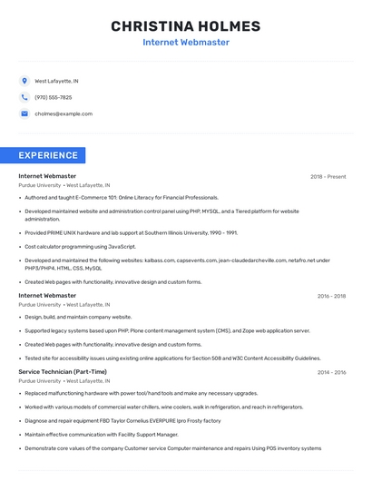 Build a professional internet webmaster resume in minutes. Our AI resume writing assistant will guide you through every step of the process, and you can choose from 10+ resume templates to create your internet webmaster resume.What skills help Internet Webmasters find jobs?