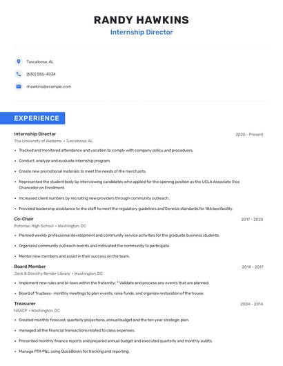 Build a professional internship director resume in minutes. Browse through our resume examples to identify the best way to word your resume. Then choose from 5+ resume templates to create your internship director resume.