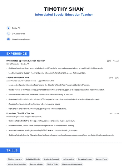 Build a professional interrelated special education teacher resume in minutes. Browse through our resume examples to identify the best way to word your resume. Then choose from 5+ resume templates to create your interrelated special education teacher resume.