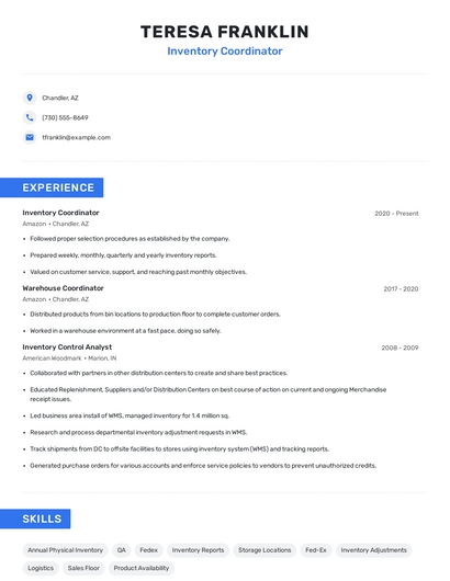 Build a professional inventory coordinator resume in minutes. Browse through our resume examples to identify the best way to word your resume. Then choose from 5+ resume templates to create your inventory coordinator resume.