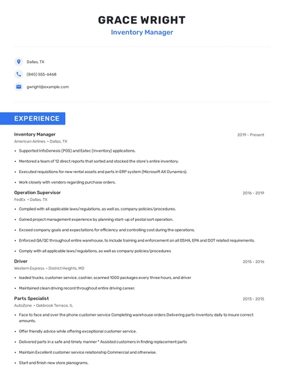 Build a professional inventory manager resume in minutes. Browse through our resume examples to identify the best way to word your resume. Then choose from 5+ resume templates to create your inventory manager resume.