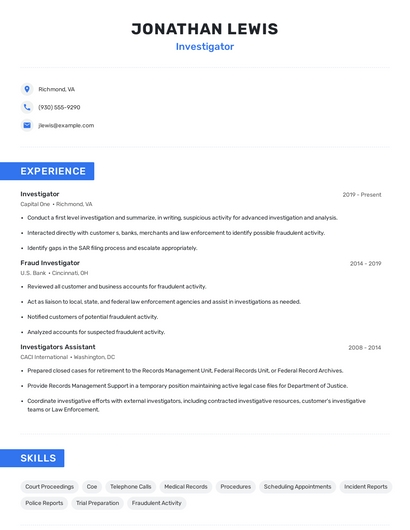 Build a professional investigator resume in minutes. Browse through our resume examples to identify the best way to word your resume. Then choose from 5+ resume templates to create your investigator resume.