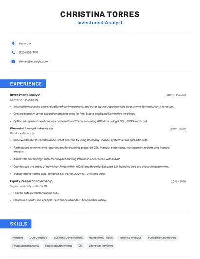 Build a professional investment analyst resume in minutes. Browse through our resume examples to identify the best way to word your resume. Then choose from 5+ resume templates to create your investment analyst resume.