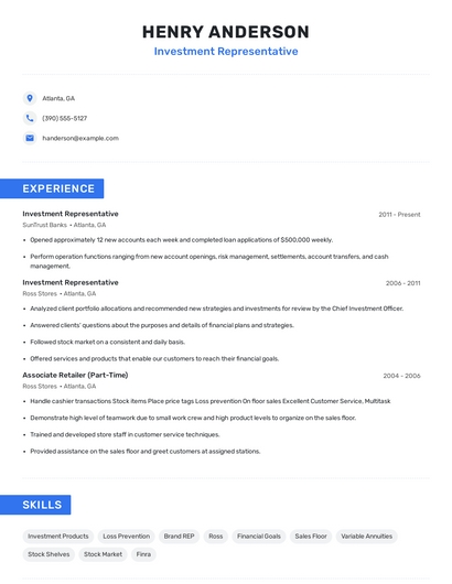 Build a professional investment representative resume in minutes. Browse through our resume examples to identify the best way to word your resume. Then choose from 5+ resume templates to create your investment representative resume.