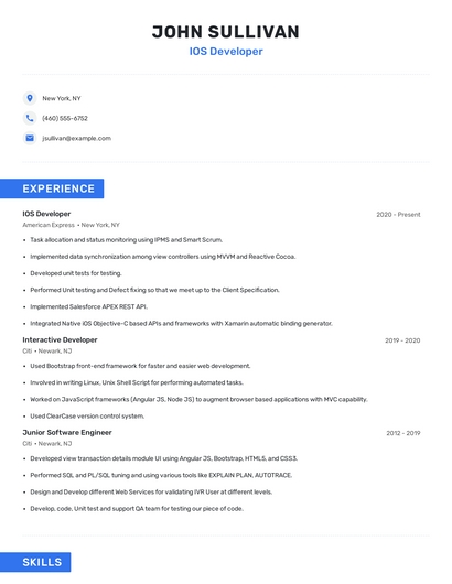 Build a professional ios developer resume in minutes. Our AI resume writing assistant will guide you through every step of the process, and you can choose from 10+ resume templates to create your ios developer resume.7. Java