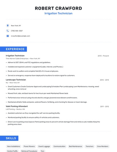 Build a professional irrigation technician resume in minutes. Browse through our resume examples to identify the best way to word your resume. Then choose from 5+ resume templates to create your irrigation technician resume.
