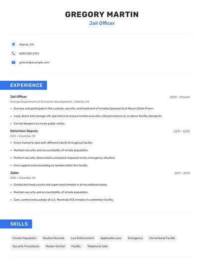 Build a professional jail officer resume in minutes. Browse through our resume examples to identify the best way to word your resume. Then choose from 5+ resume templates to create your jail officer resume.
