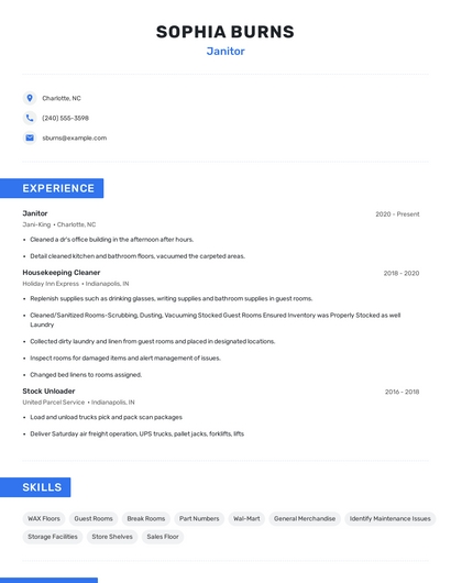 Build a professional janitor resume in minutes. Browse through our resume examples to identify the best way to word your resume. Then choose from 5+ resume templates to create your janitor resume.