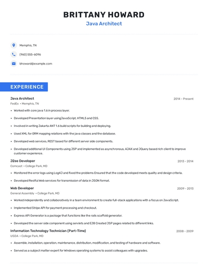 Build a professional java architect resume in minutes. Browse through our resume examples to identify the best way to word your resume. Then choose from 5+ resume templates to create your java architect resume.