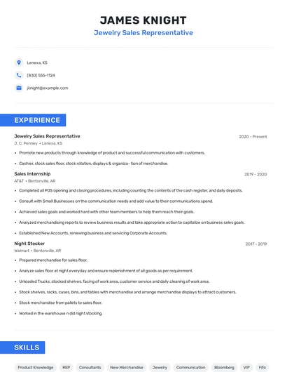 Build a professional jewelry sales representative resume in minutes. Browse through our resume examples to identify the best way to word your resume. Then choose from 5+ resume templates to create your jewelry sales representative resume.