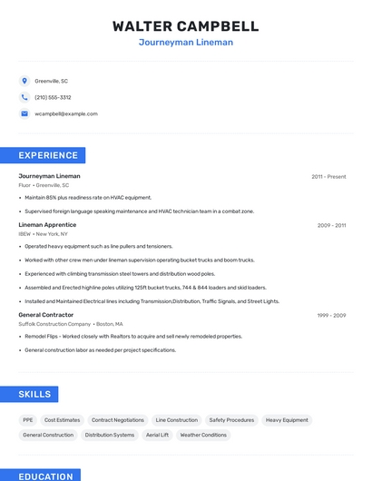 Build a professional journeyman lineman resume in minutes. Browse through our resume examples to identify the best way to word your resume. Then choose from 5+ resume templates to create your journeyman lineman resume.