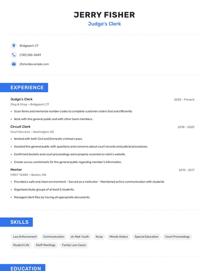 Build a professional judge's clerk resume in minutes. Our AI resume writing assistant will guide you through every step of the process, and you can choose from 10+ resume templates to create your judge's clerk resume.7. Court Dates