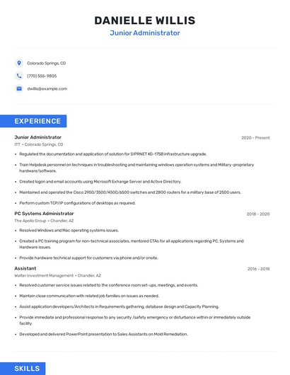 Build a professional junior administrator resume in minutes. Browse through our resume examples to identify the best way to word your resume. Then choose from 5+ resume templates to create your junior administrator resume.