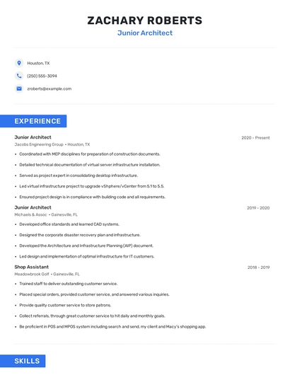 Build a professional junior architect resume in minutes. Browse through our resume examples to identify the best way to word your resume. Then choose from 5+ resume templates to create your junior architect resume.